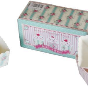 In einer ganz romantisch bemalten Dose kommen zwei verschiedene viereckige Backförmchen, einmal im Design zartgrün-weiß gestreift mit Rosen und einmal pink-weiß kariert mit kleinen Vögeln. Ein ganz besonderes Augenmerk verdient der feine gewellte Rand der Förmchen, ein dekoratives Detail, was aber auffällt.